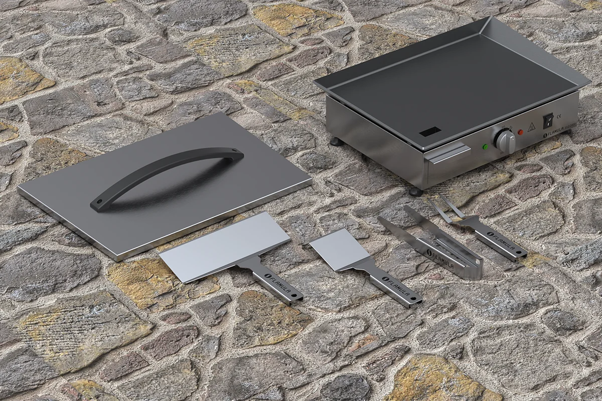 • View of the ELQ2000 electric grill with smooth heating plate and metal housing.