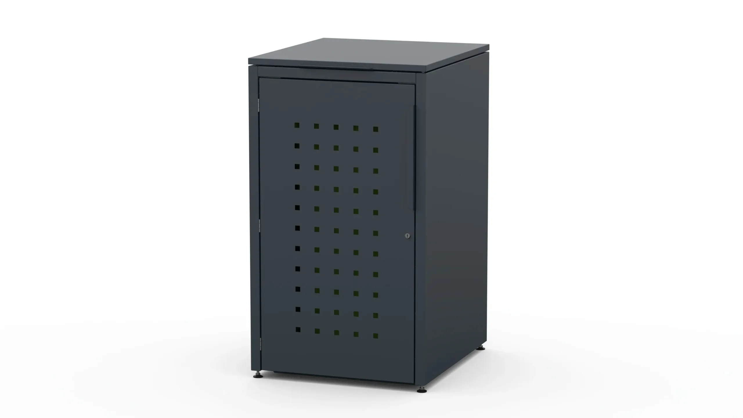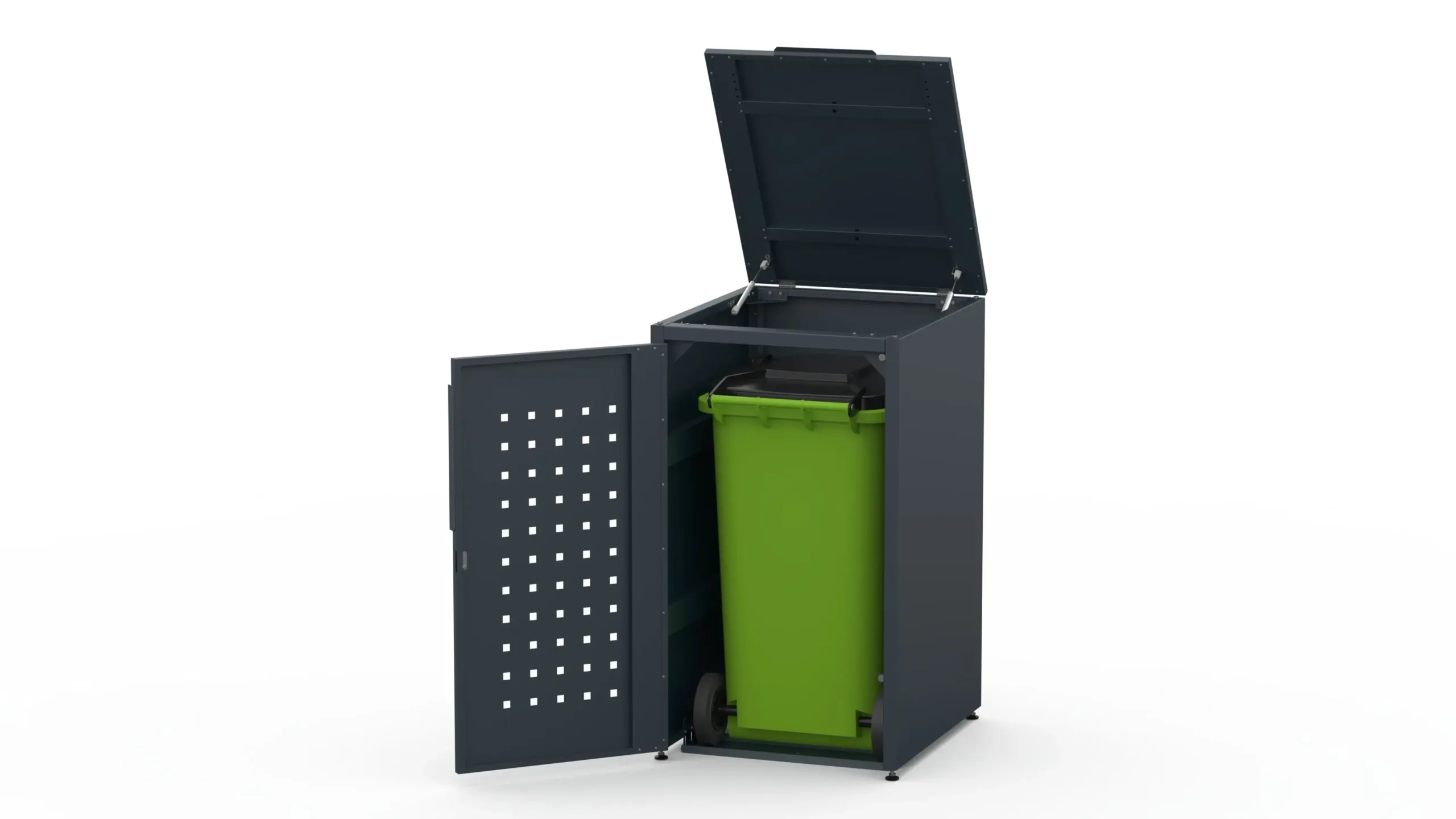 The Flamula single bin cover is a practical and well-designed product for storing one 240-litre waste bin. It is made of high-quality 1.5 mm thick galvanised sheet metal and is resistant to corrosion, moisture and mechanical damage. It is additionally powder-coated in an elegant anthracite color (RAL 7016 FS with a fine structure), which provides excellent protection against UV rays, scratches, and weather influences. This treatment ensures that the bin cover remains visually appealing and rust-free even after many years, regardless of whether it is exposed to sun, rain, or snow.