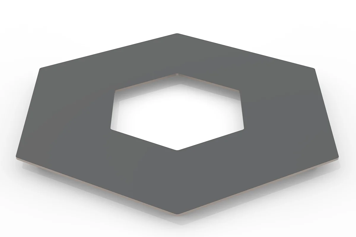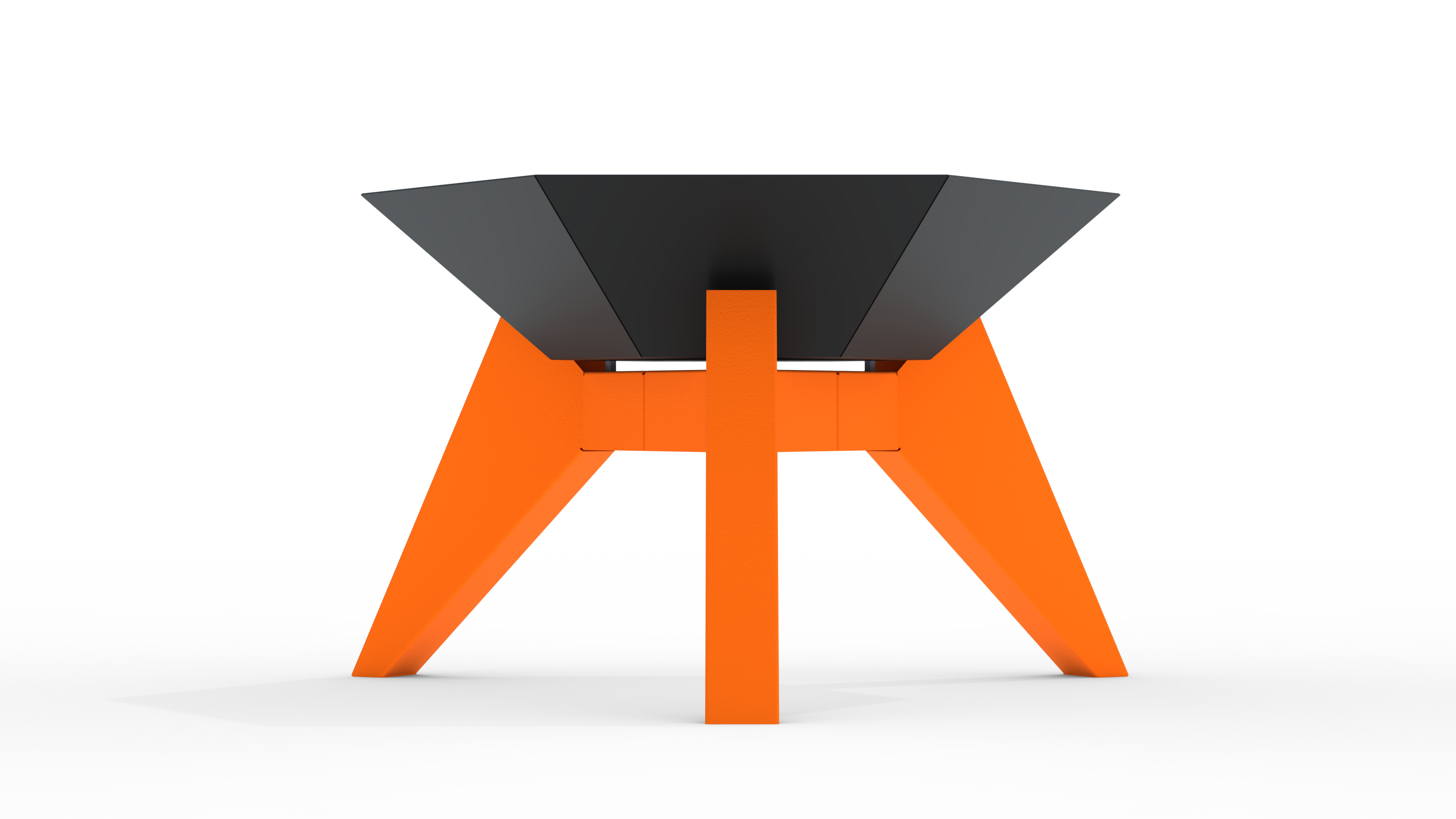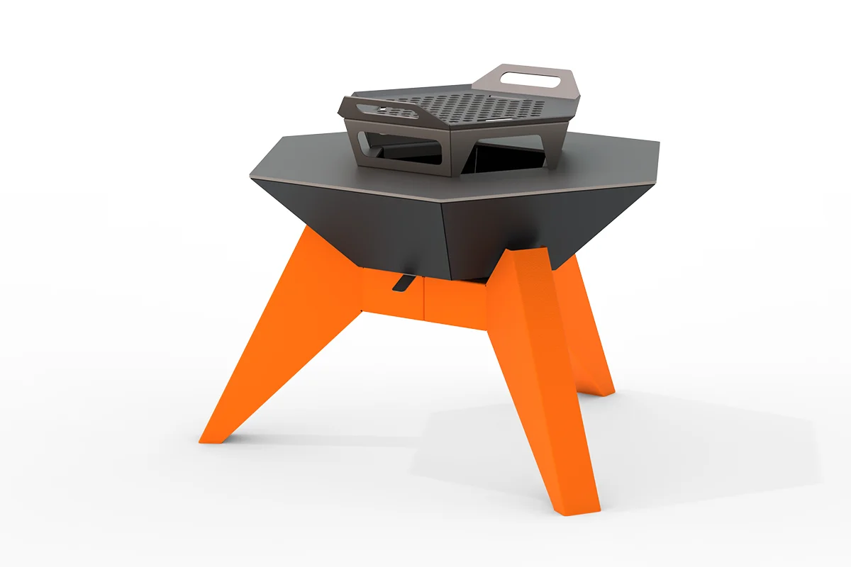 • The Flamula 800 metal fire pit with a modern hexagonal design and orange legs is suitable for outdoor use.c