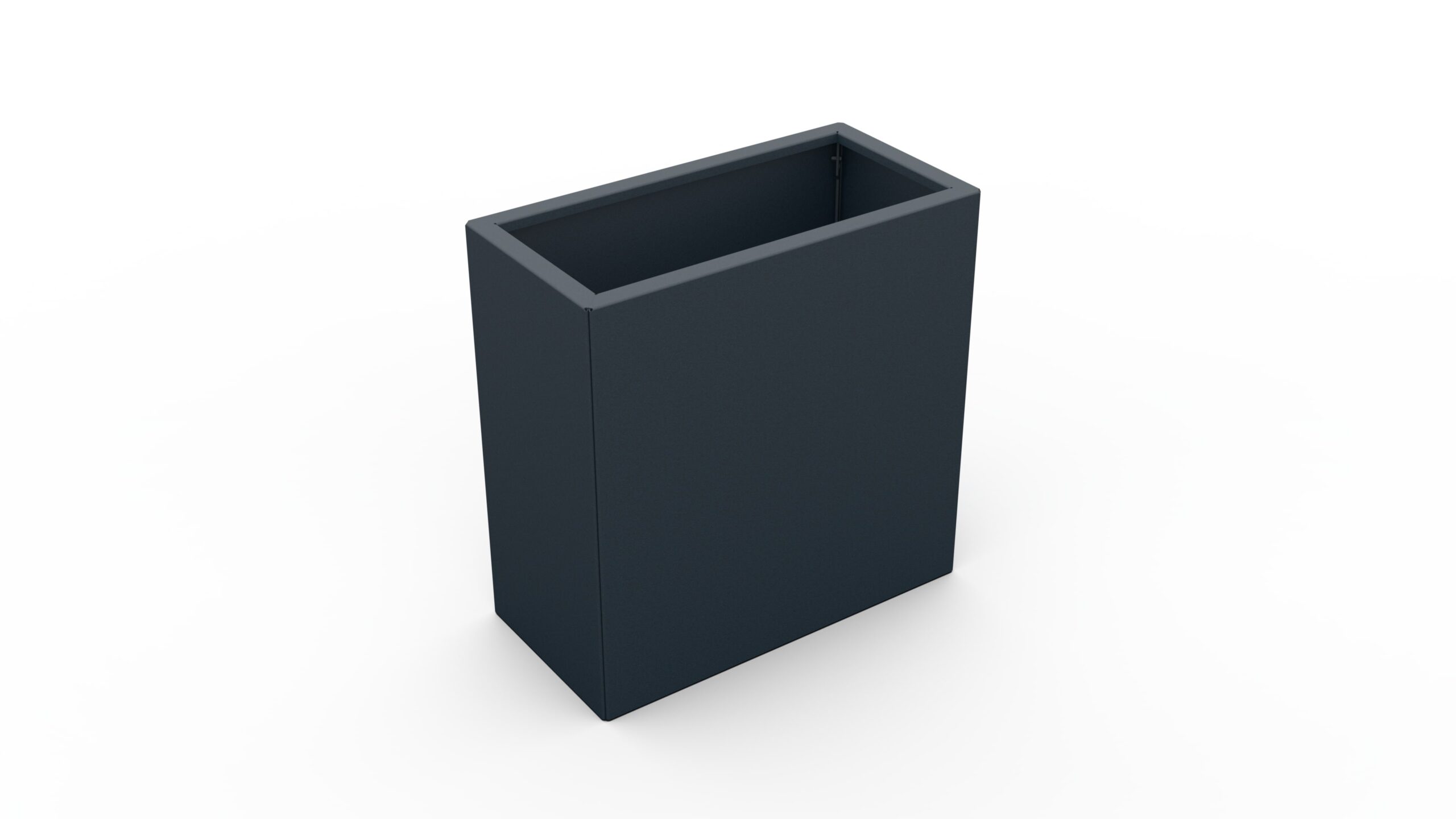 The planter is made of high-quality 1.5 mm thick galvanized sheet metal, which ensures excellent corrosion resistance and a long service life. The surface is painted with UV-resistant and waterproof paint in RAL 7016 FS (anthracite gray), which ensures a modern and elegant appearance and additional protection against weather influences.